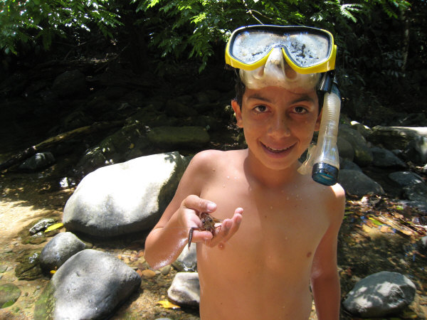 Omer zeigt uns, wie man im Fluss Krebse fängt.