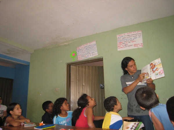 Studenten führen im Quartier ein Kulturzentrum. Die Kinder sind mit Interesse und Begeisterung dabei.