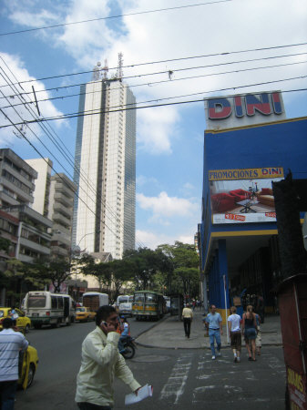 Auf dem Dach des höchsten Wolkenkratzers zeigt uns Thomas die Millionenstadt Cali.